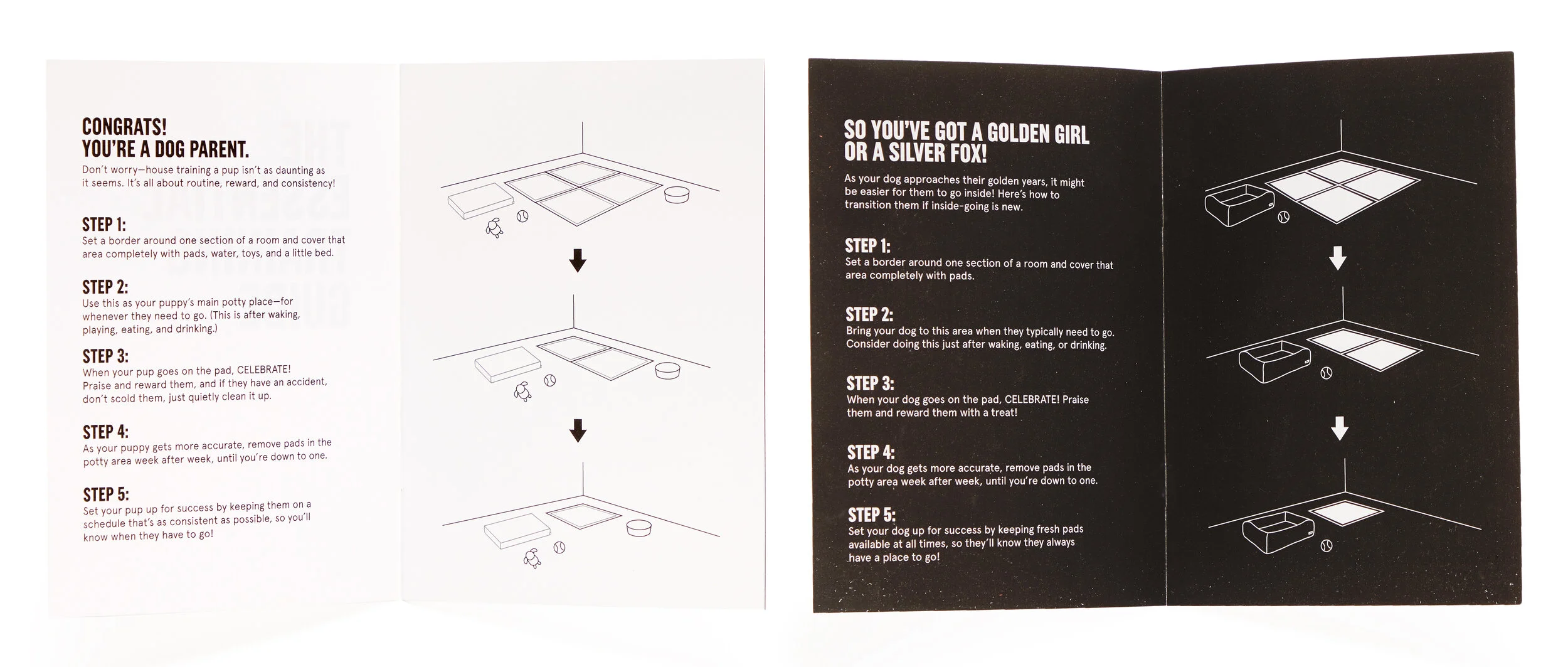Training pads are not only for house training young puppies. Senior dogs who are adjusting to an aging lifestyle and adult dogs who have health challenges can also benefit from having a place to go inside. It is also great for post-operation or surgery aftercare. The packaging includes a training guide to support and help dog parents who are going through potty training process.